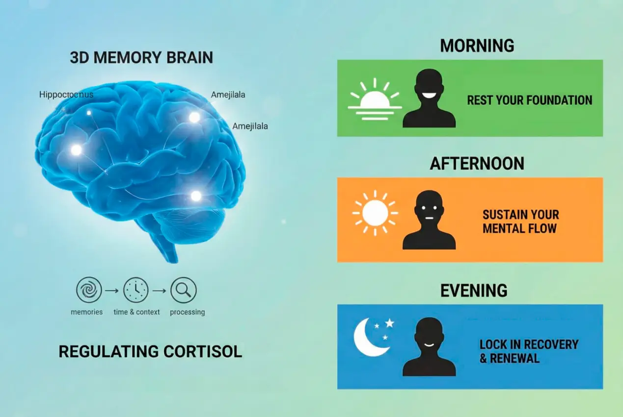 At night, it's not just about sleeping-it's about deepening recovery. We help your body's natural cortisol dip occur smoothly, so you unwind fully and slip into restorative sleep. This is when your brain organizes memory and learning. Wake up truly reset, with mental clarity that carries into tomorrow-and beyond 3D Memory isn't just a concept-it's your daily rhythm, rebuilt.